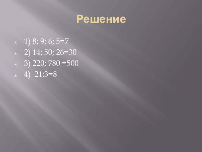 Решение1) 8; 9; 6; 5=72) 14; 50; 26=303) 220; 780 =5004) 21;3=8