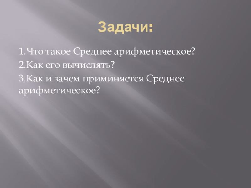 Задачи:1.Что такое Среднее арифметическое?2.Как его вычислять?3.Как и зачем приминяется Среднее арифметическое?