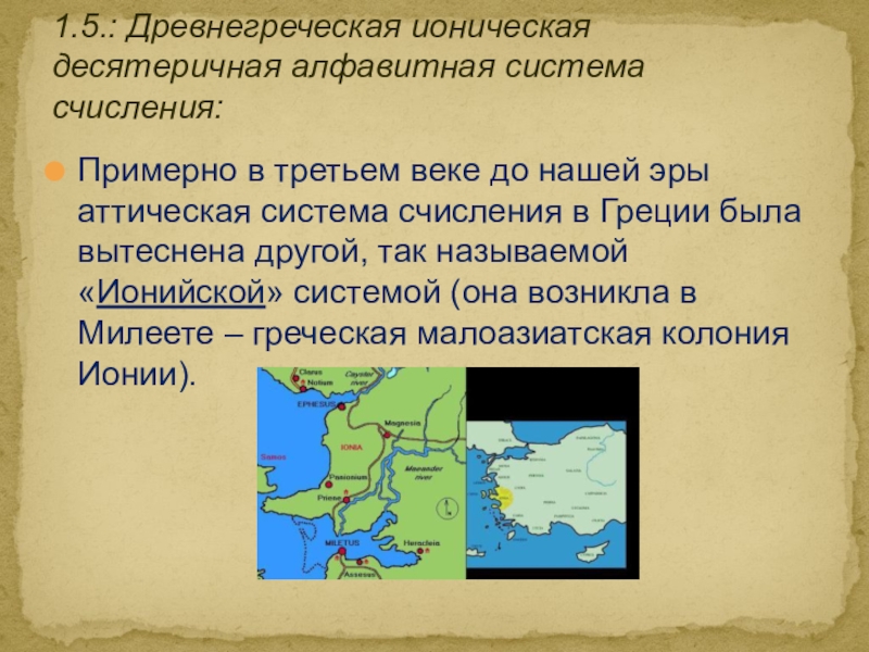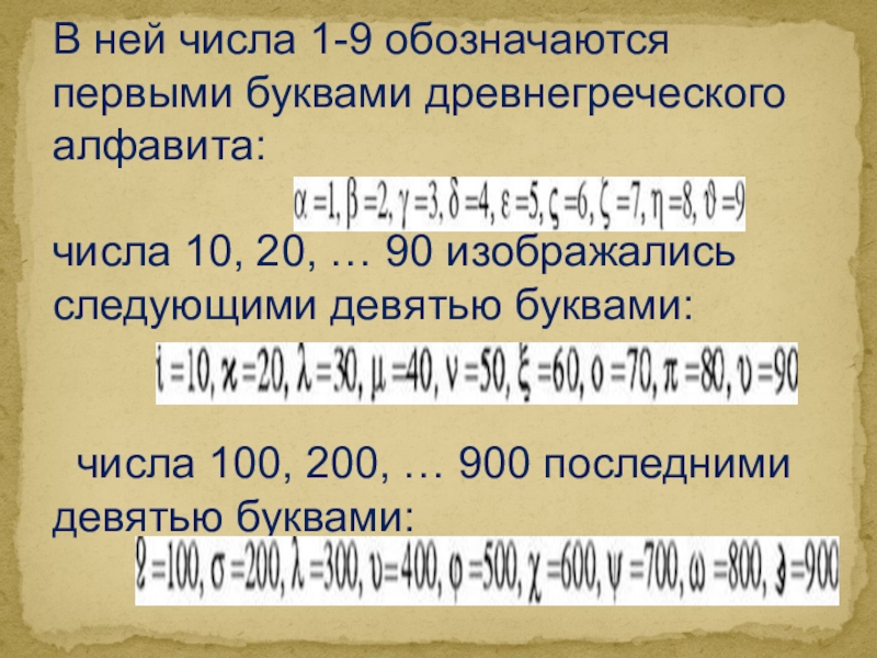 1.5.: Древнегреческая ионическая десятеричная алфавитная система счисления: