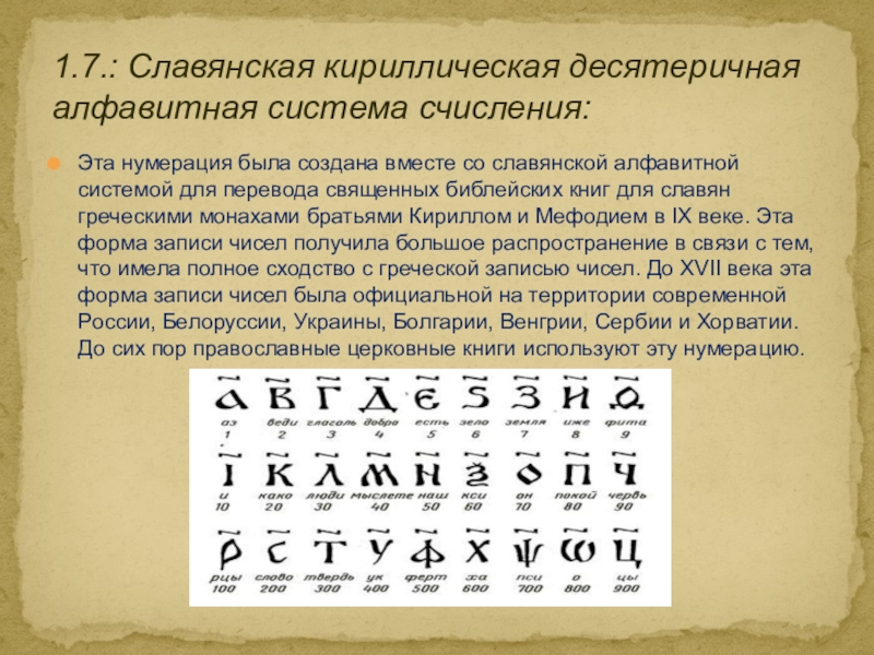 1.7.: Славянская кириллическая десятеричная алфавитная система счисления: