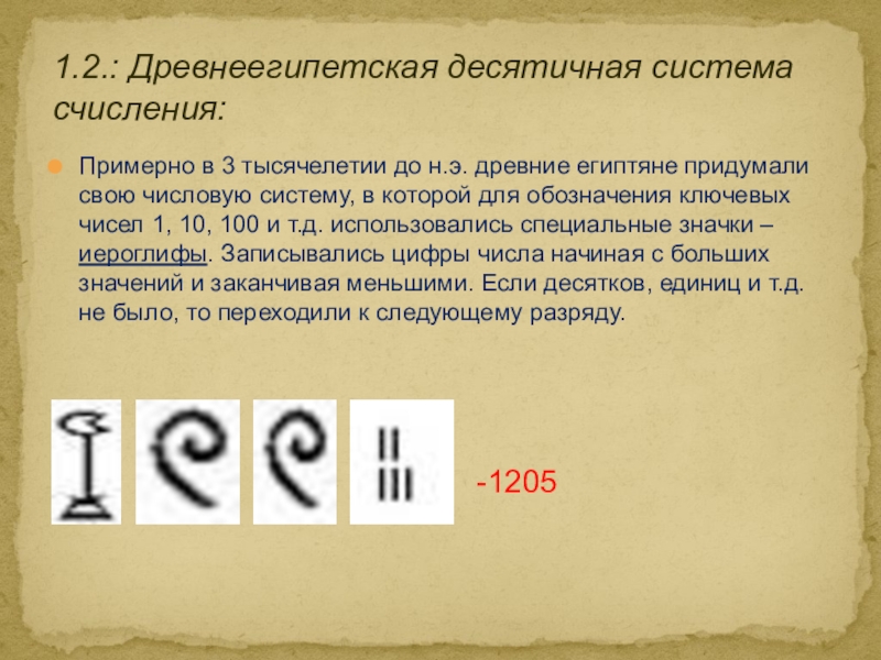 1.2.: Древнеегипетская десятичная система счисления: