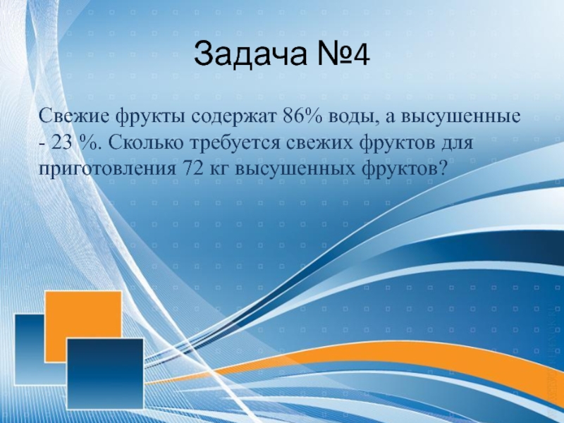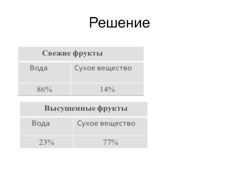 Задача №4Свежие фрукты содержат 86% воды, а высушенные - 23 %. Сколько требуется свежих фруктов для приготовления