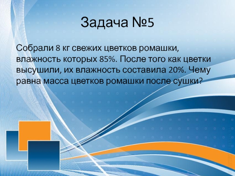 Задача №5Собрали 8 кг свежих цветков ромашки, влажность которых 85%. После того как цветки высушили, их влажность