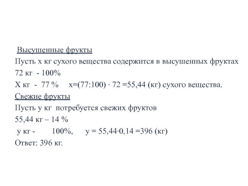 Высушенные фруктыПусть х кг сухого вещества содержится в высушенных фруктах72 кг - 100%Х кг - 77
