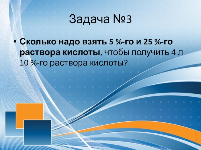 Задача №3Сколько надо взять 5 %-го и 25 %-го раствора кислоты, чтобы получить 4 л 10 %-го