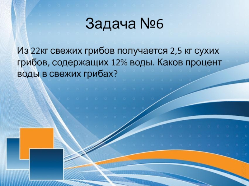 Задача №6Из 22кг свежих грибов получается 2,5 кг сухих грибов, содержащих 12% воды. Каков процент воды в