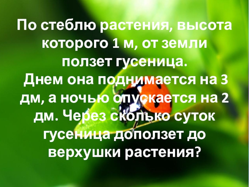 Слайд 3По стеблю растения, высота которого 1 м, от земли ползет гусеница.