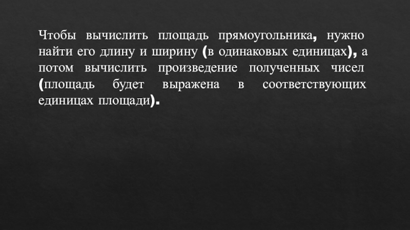 Слайд 4Чтобы вычислить площадь прямоугольника, нужно найти его длину и ширину (в
