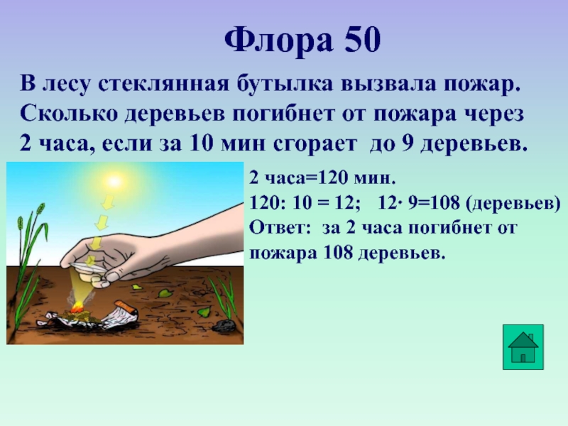 Ответ: за 2 часа погибнет от пожара 108 деревьев.
