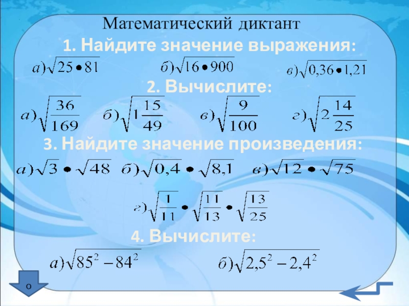 Математический диктант1. Найдите значение выражения:2. Вычислите:3. Найдите значение произведения:4. Вычислите:о