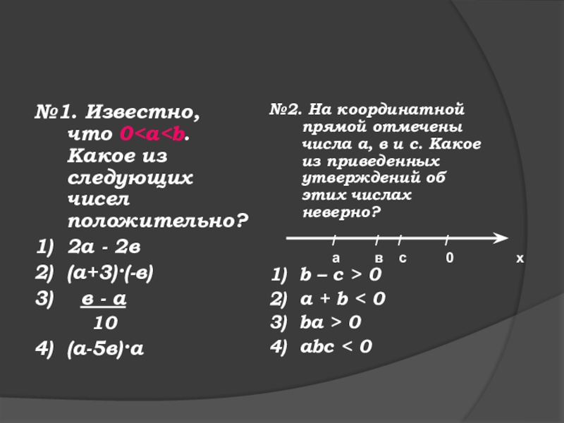 №2. На координатной прямой отмечены числа а, в и с. Какое из приведенных утверждений об этих числах неверно?