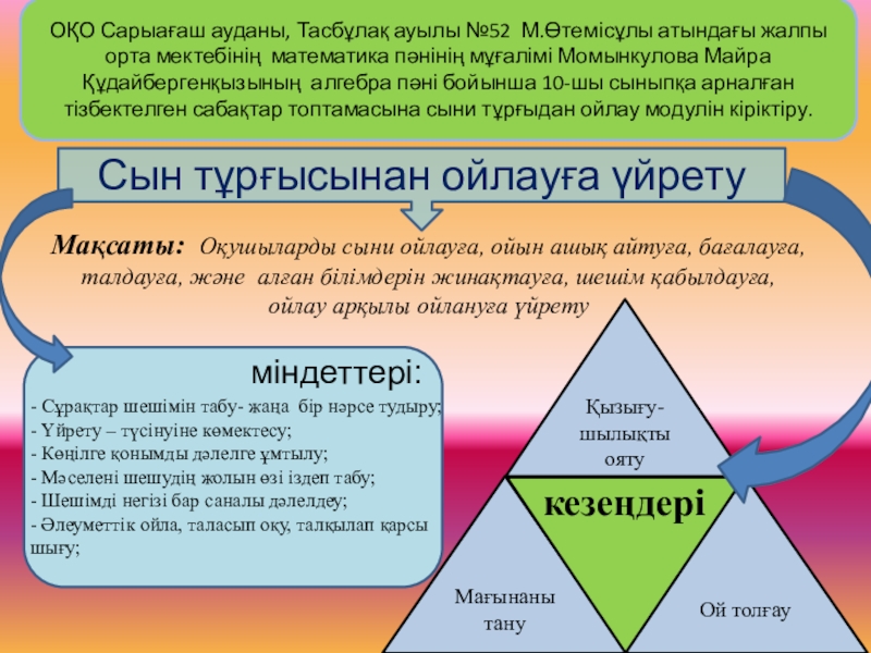 Мақсаты: Оқушыларды сыни ойлауға, ойын ашық айтуға, бағалауға, талдауға, және алған білімдерін жинақтауға, шешім қабылдауға,