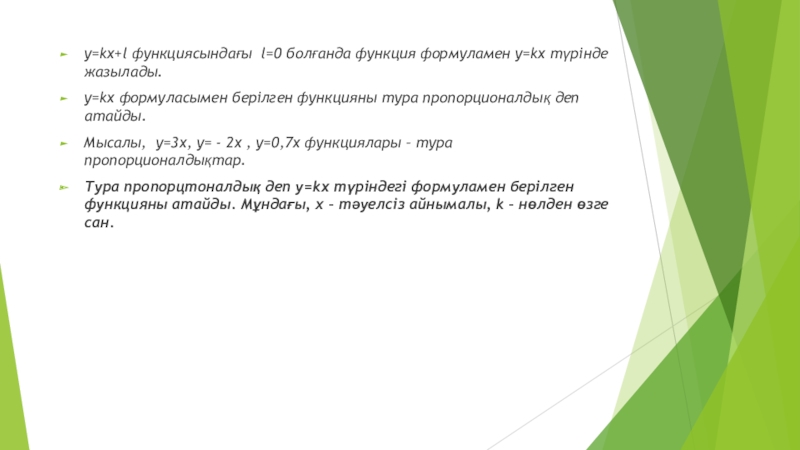 Слайд 2y=kx+l функциясындағы l=0 болғанда функция формуламен y=kx түрінде жазылады.