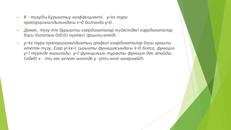 Слайд 3K – түзудің бұрыштыұ коэффициенті. y=kx тура пропорционалдығындағы х=0 болғанда у=0.