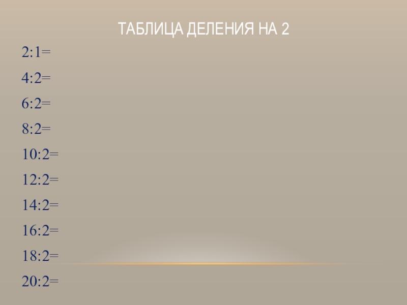 Таблица деления на 2 2:1=4:2=6:2= 8:2=10:2=12:2=14:2=16:2=18:2=20:2=