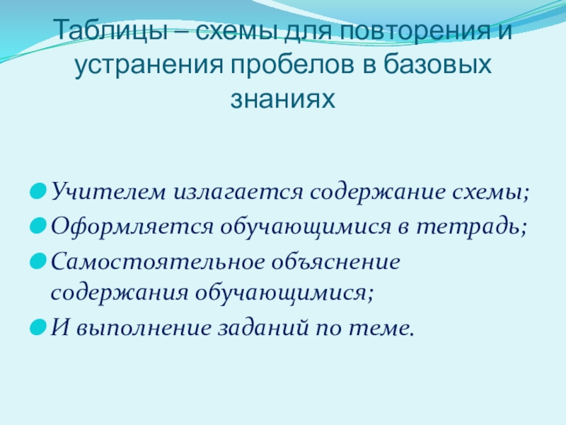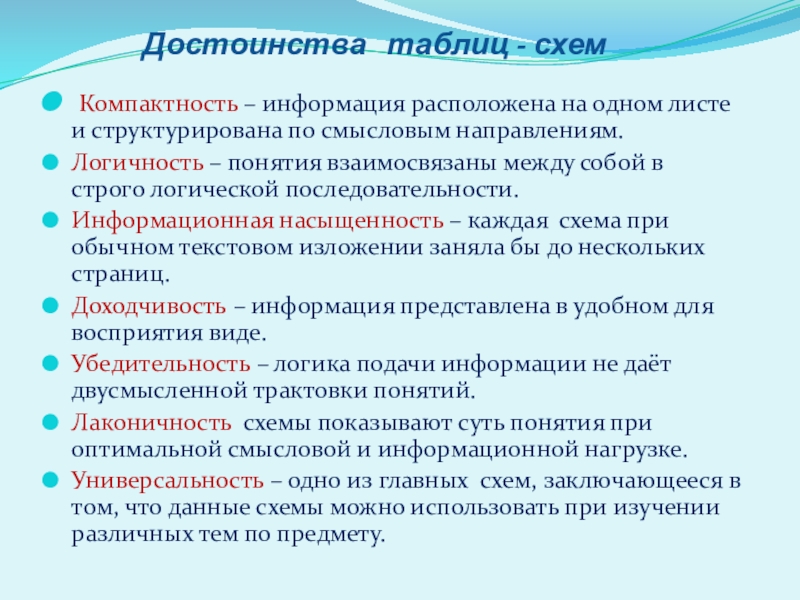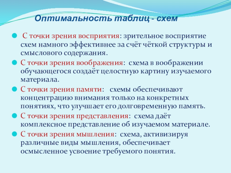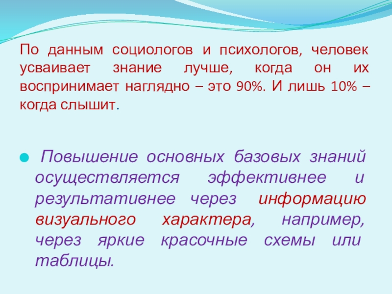 Повышение основных базовых знаний осуществляется эффективнее и результативнее через информацию визуального характера, например, через яркие красочные схемы или таблицы.