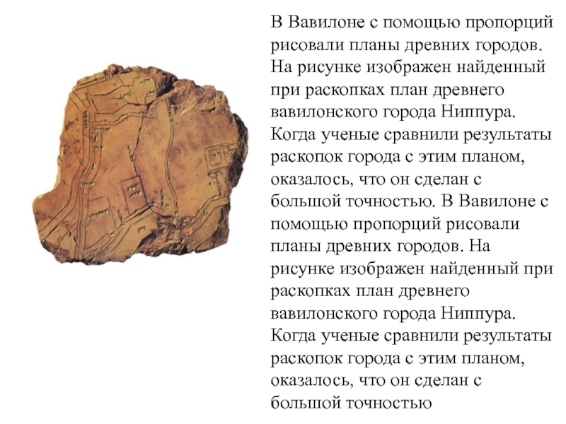 изображен найденный при раскопках план древнего вавилонского города Ниппура. Когда ученые сравнили результаты раскопок города с этим планом, оказалось, что он сделан с большой точностью. В Вавилоне с помощью пропорций рисовали планы древних городов. На рисунке изображен найденный при раскопках план древнего вавилонского города Ниппура. Когда ученые сравнили результаты раскопок города с этим планом, оказалось, что он сделан с большой точностью