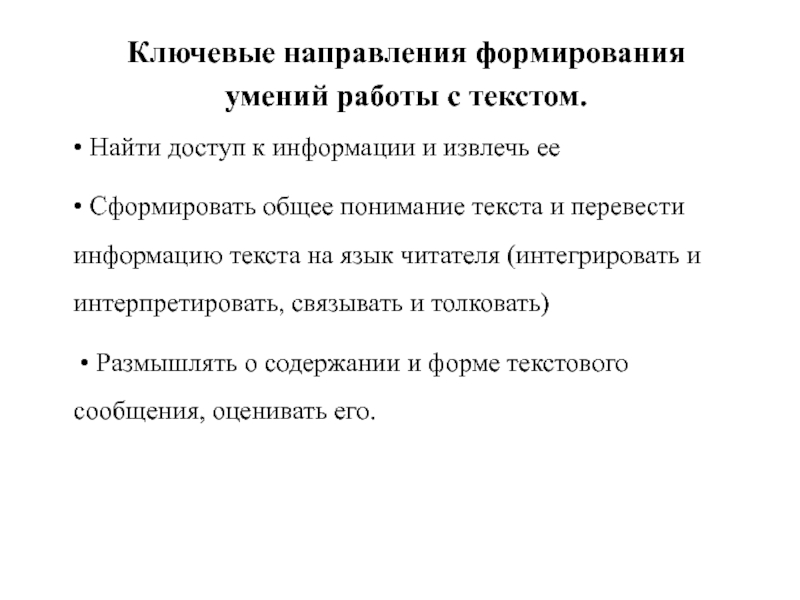 Слайд 9Ключевые направления формирования умений работы с текстом.