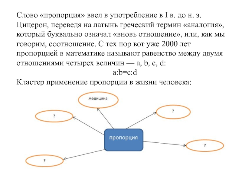 Цицерон, переведя на латынь греческий термин «аналогия», который буквально означал «вновь отношение», или, как мы говорим, соотношение. С тех пор вот уже 2000 лет пропорцией в математике называют равенство между двумя отношениями четырех величин — a, b, c, d:
