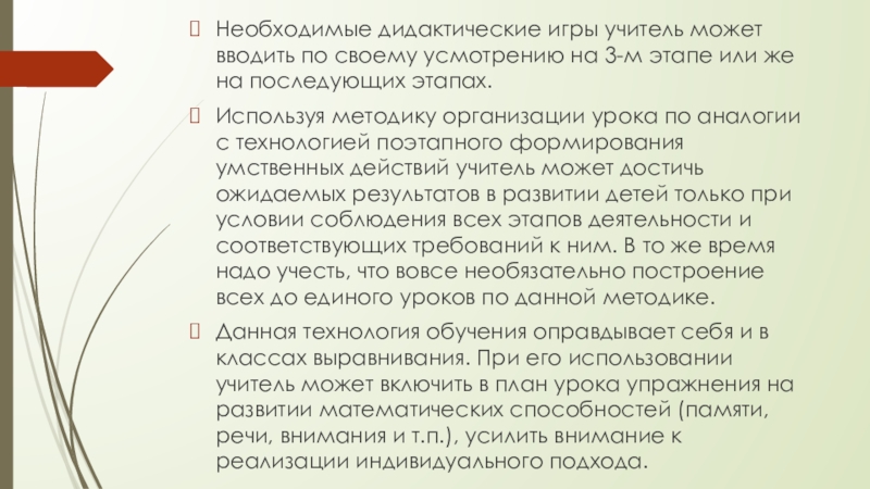 Используя методику организации урока по аналогии с технологией поэтапного формирования умственных действий учитель может достичь ожидаемых результатов в развитии детей только при условии соблюдения всех этапов деятельности и соответствующих требований к ним. В то же время надо учесть, что вовсе необязательно построение всех до единого уроков по данной методике.