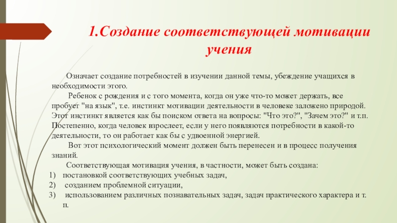 Ребенок с рождения и с того момента, когда он уже что-то может держать, все пробует "на язык", т.е. инстинкт мотивации деятельности в человеке заложено природой. Этот инстинкт является как бы поиском ответа на вопросы: "Что это?", "Зачем это?" и т.п. Постепенно, когда человек взрослеет, если у него появляются потребности в какой-то деятельности, то он работает как бы с удвоенной энергией.