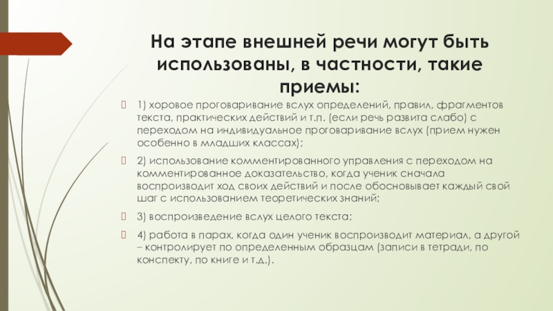 Слайд 19На этапе внешней речи могут быть использованы, в частности, такие приемы: