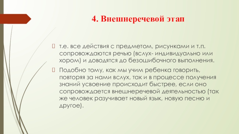 внешней речи, происходит его дальнейшее обобщение, но оно еще не автоматизитировано. Необходимо отметить, что речевое действие должно быть освоено в развернутом виде, нужно, чтобы все входящие в него операции не только приобрели речевую форму, но и были усвоены. На этом этапе действие может быть обобщено путем введения в него ситуаций с неопределенными условиями. Несмотря на то, что в конце этапа действие начинает выполняться с пропуском в речевой форме отдельных операций, оно не должно доводиться до автоматизации.
