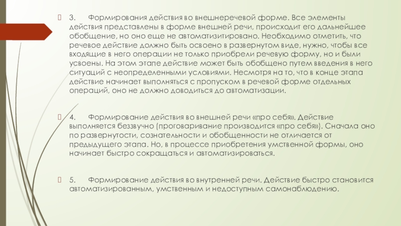 Слайд 4Прежде чем стать умственным, обобщенным, сокращенным и освоенным, действие проходит несколько