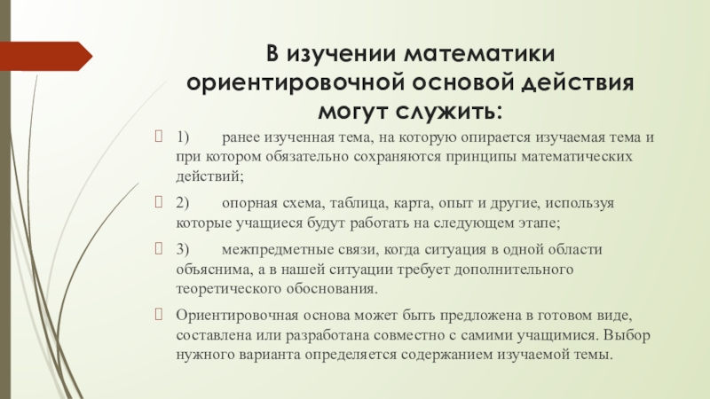 Слайд 12В изучении математики ориентировочной основой действия могут служить: