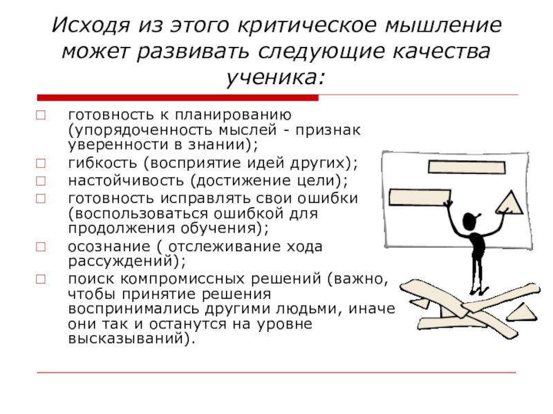 Слайд 6Исходя из этого критическое мышление может развивать следующие качества ученика: