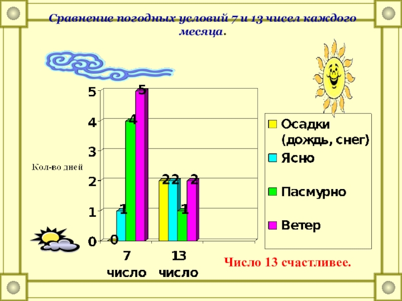 Слайд 18Сравнение погодных условий 7 и 13 чисел каждого месяца.