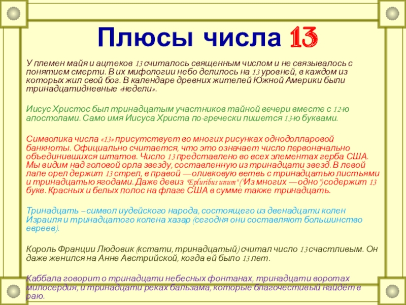 Слайд 22Плюсы числа 13