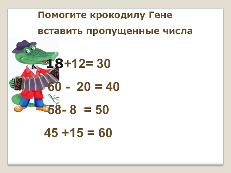 Помогите крокодилу Гене 		  вставить пропущенные числа			 18+12= 30			  60 - 20 =
