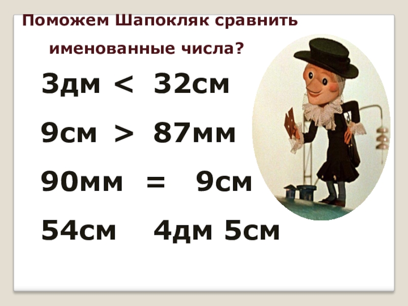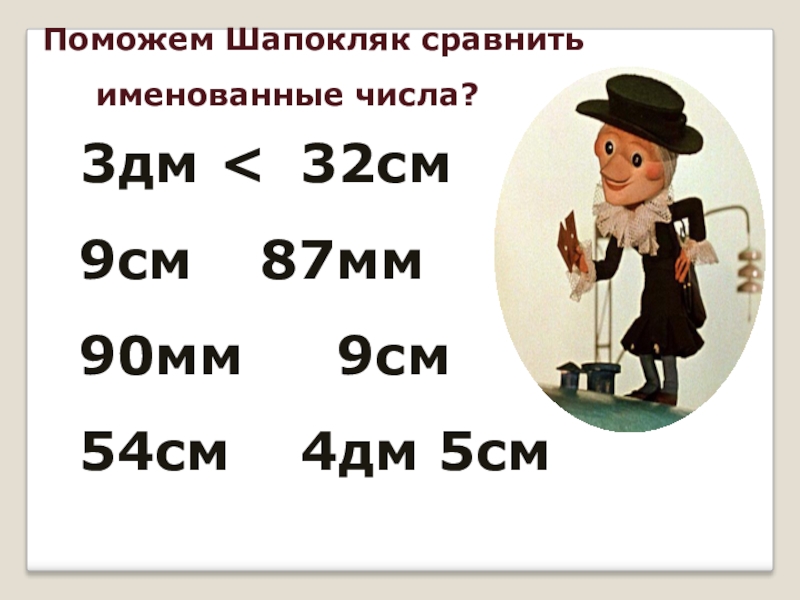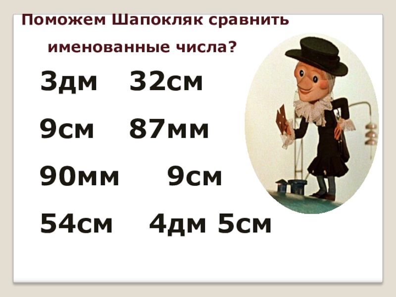 Слайд 8Поможем Шапокляк сравнить именованные числа? 3дм 32см 9см