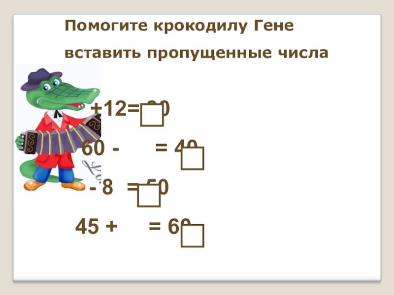 Помогите крокодилу Гене 		  вставить пропущенные числа				 +12= 30			  60 -
