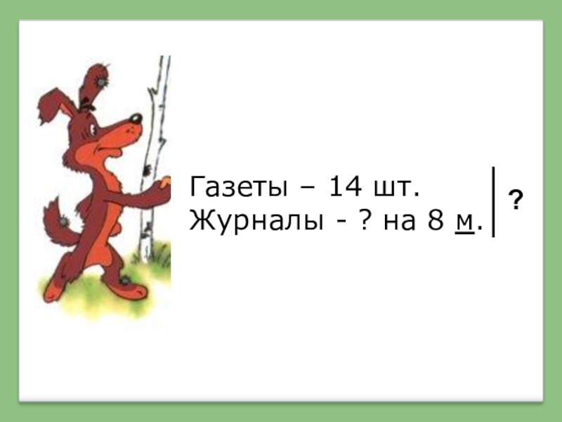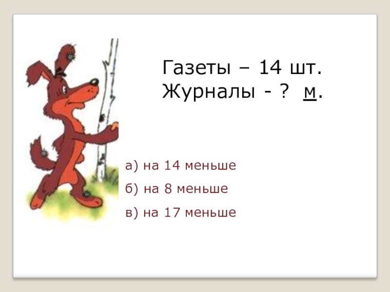 Газеты – 14 шт.Журналы - ? м.а) на 14 меньшеб) на 8 меньшев) на 17 меньше