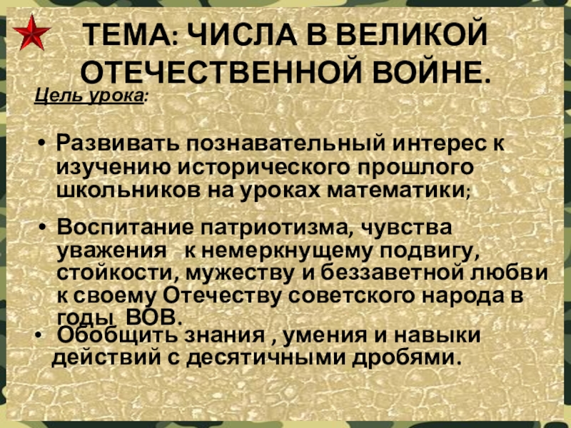 Воспитание патриотизма, чувства уважения к немеркнущему подвигу, стойкости, мужеству и беззаветной любви к своему Отечеству советского народа в годы ВОВ.