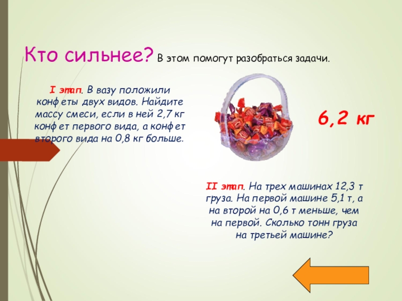 II этап. На трех машинах 12,3 т груза. На первой машине 5,1 т, а на второй на 0,6 т меньше, чем на первой. Сколько тонн груза на третьей машине?