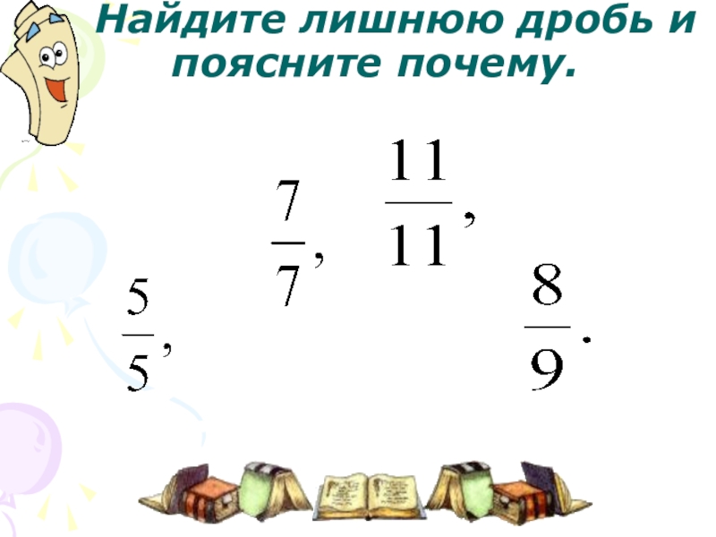 Слайд 5 Найдите лишнюю дробь и поясните почему.