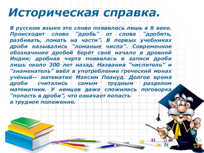 Происходит слово “дробь” от слова “дробить, разбивать, ломать на части”. В первых учебниках дроби назывались “ломаные числа”. Современное обозначение дробей берёт своё начало в древней Индии; дробная черта появилась в записи дроби лишь около 300 лет назад. Названия “числитель” и “знаменатель” ввёл в употребление греческий монах учёный-- математик Максим Пеануд. Долгое время дроби считались самым трудным разделом математики. У немцев даже сложилась поговорка “попасть в дроби”, что означает попасть