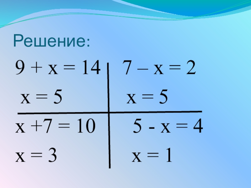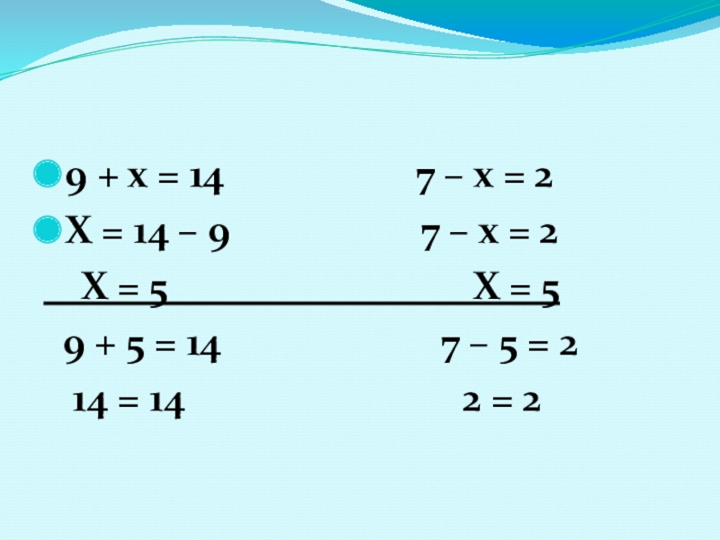 Решение:9 + х = 14  7 – х = 2    х = 5