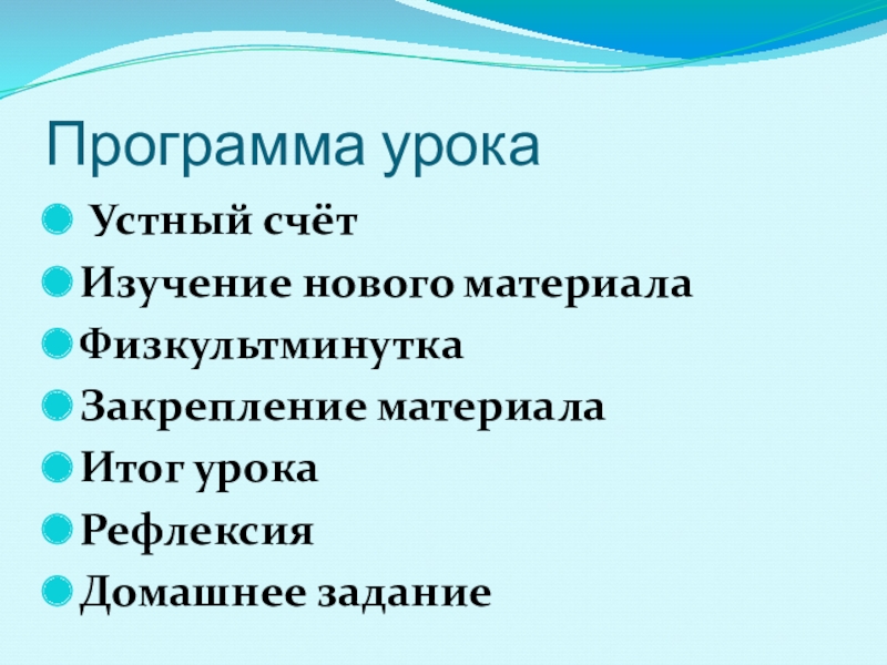 Программа урока Устный счётИзучение нового материалаФизкультминуткаЗакрепление материала Итог урокаРефлексияДомашнее задание