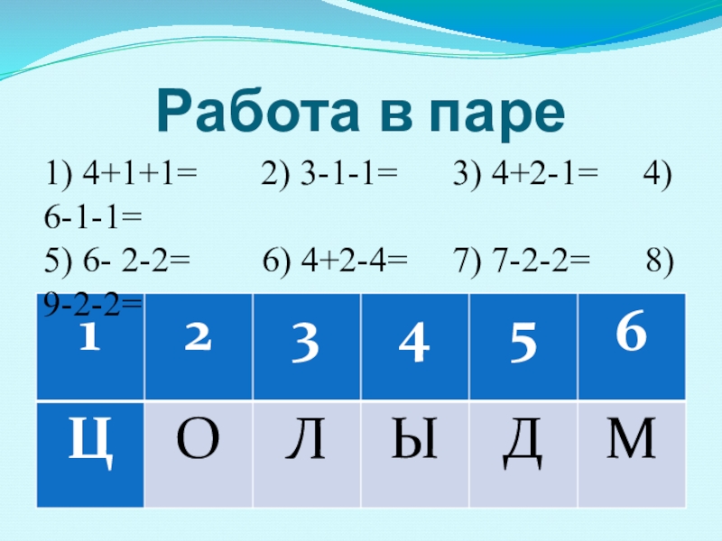 Работа в паре 1) 4+1+1=    2) 3-1-1=   3) 4+2-1=   4)