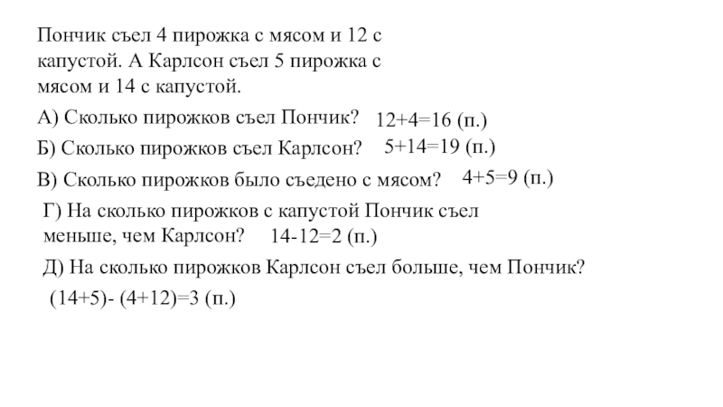 Д) На сколько пирожков Карлсон съел больше, чем Пончик?