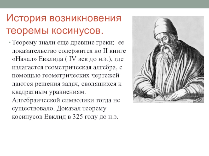 во II книге «Начал» Евклида ( IV век до н.э.), где излагается геометрическая алгебра, с помощью геометрических чертежей даются решения задач, сводящихся к квадратным уравнениям. Алгебраической символики тогда не существовало. Доказал теорему косинусов Евклид в 325 году до н.э.