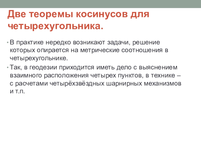 Так, в геодезии приходится иметь дело с выяснением взаимного расположения четырех пунктов, в технике – с расчетами четырёхзвёздных шарнирных механизмов и т.п.