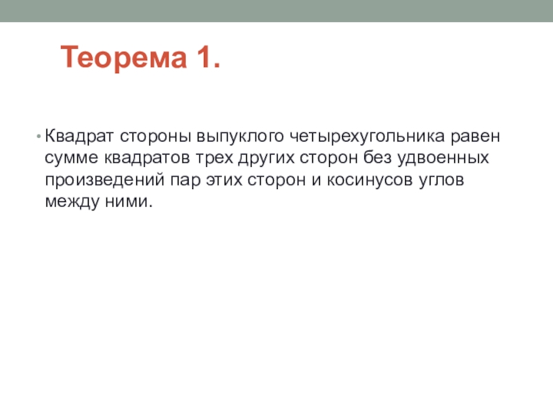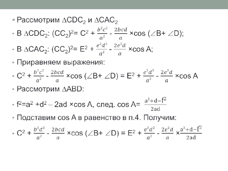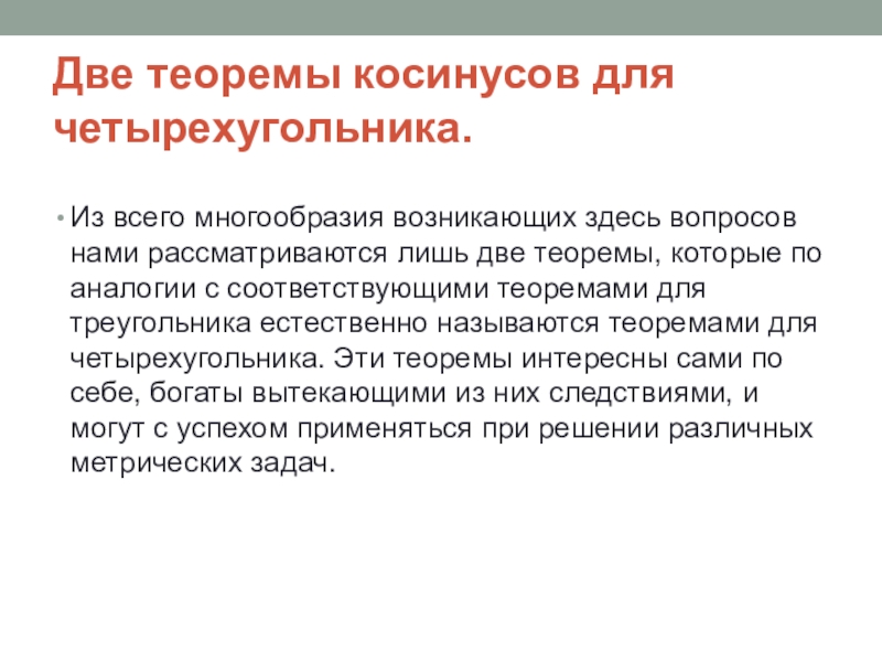 Слайд 10Две теоремы косинусов для четырехугольника.
