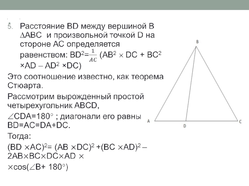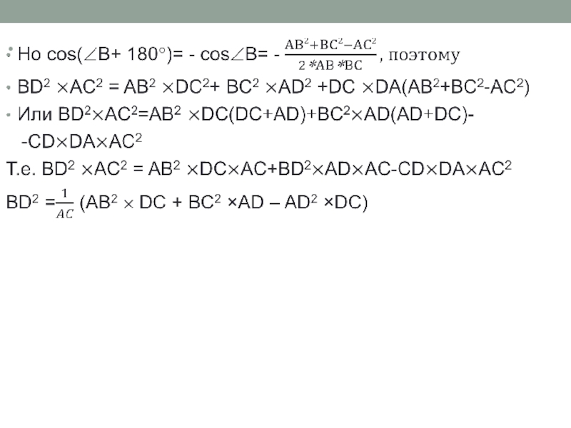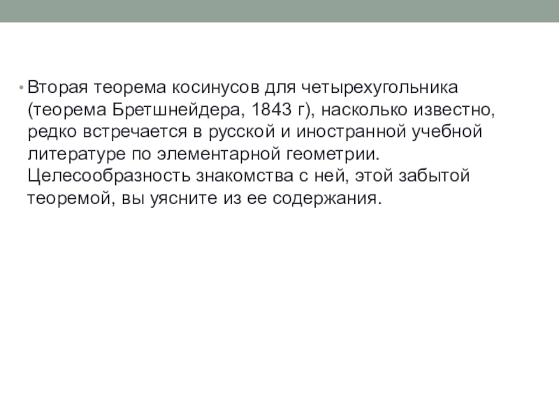 Слайд 19Вторая теорема косинусов для четырехугольника (теорема Бретшнейдера, 1843 г), насколько известно,