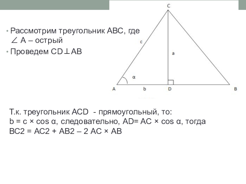 Слайд 6Рассмотрим треугольник АВС, где А – острый