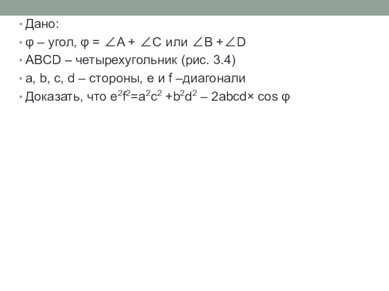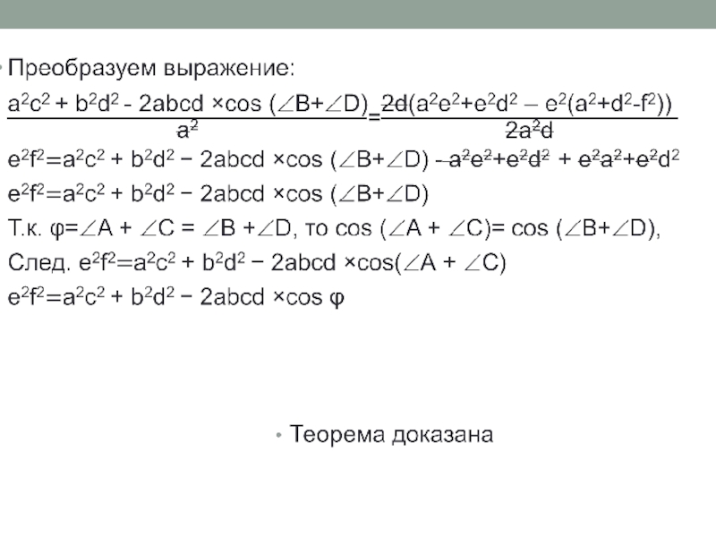 Доказать, что e2f2=a2c2 +b2d2 – 2abcd× cos φ